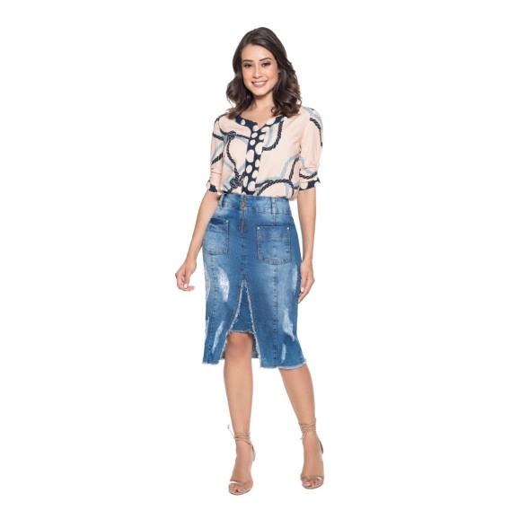 Detalhe: saia jeans possui bolsos frontais, fechamento em zíper, detalhe desfiado. Saia super despojada para você montar vários looks!