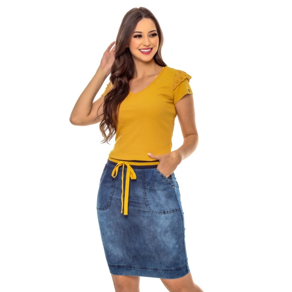 Saia Jeans com Faixa Amarela Hapuk, Saia jeans com elastano. Possui alta elasticidade, o que possibilita mais conforto, bolsos funcionais e ribana no cós com elástico. Composição: 97% algodão 3% elastano.