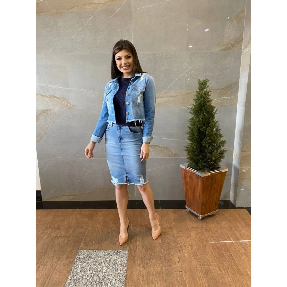Saia Jeans Destroyed Victoria's Princess confeccionada em jeans, possui um recorte diferenciado, bolsos atrás.