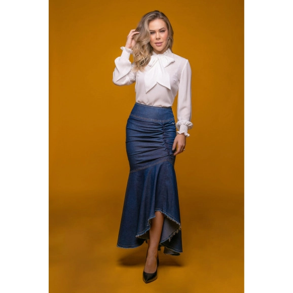 Saia Jeans Detalhe Franzido Via Tolentino, possui detalhe franzido, modelo mullet, desfiado na barra, bolsos e fechamento em zíper atrás. Composição do tecido 75%Algodão 24%Poliester 1%Elastano . Aquela saia maravilhosa para ninguém botar defeito!