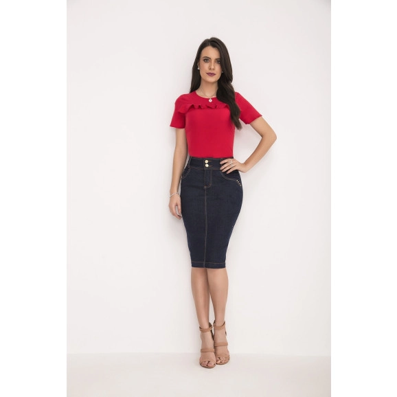 Saia Jeans Escura Laura Rosa, modelagem tradicional, possui bolsos laterais e atrás. Composição do Tecido 82%algodão 16%Poliester 2%Elastano. Peça linda e versátil, pode ser usada blusas lisas ou estampadas.