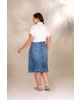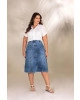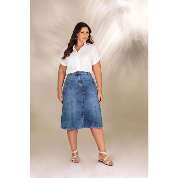 Saia Plus Size de comprimento Super Midi confeccionada em Jeans de alta qualidade da Canatiba. Possui bolsos laterais funcionais, abertura frontal até a altura do joelho e modelagem evasê.