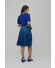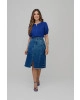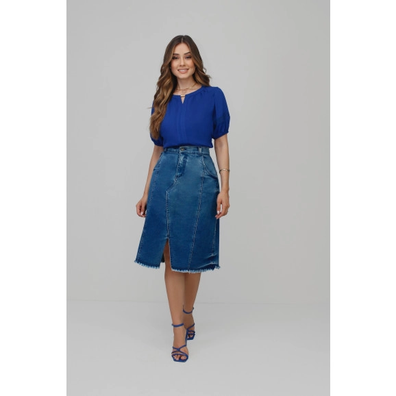 Saia no comprimento midi com shape em A, confeccionada no tecido jeans bela blue, com recorte nas linhas princesas bolso frontal e barra desfiado. Bolso traseiro em modelo invisível.