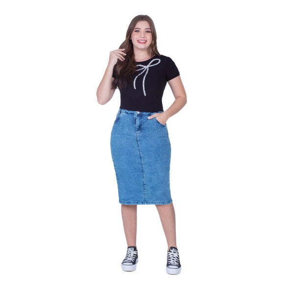 Saia confeccionada em jeans, fechamento frontal por zíper e botões, detalhe em termocolante e bolsos funcionais.