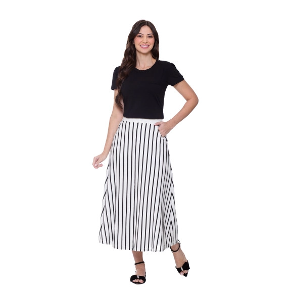 Saia confeccionada em malha listrada e lisa, fechamento frontal por botão de pressão encapado e zíper, bolsos funcionais e possui forro.