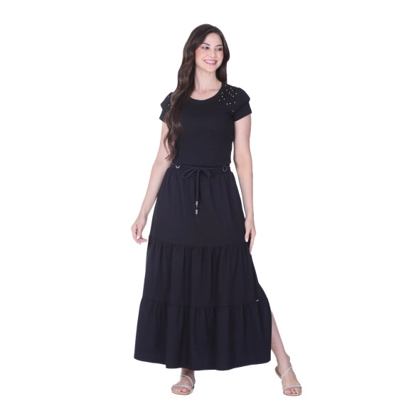 Saia confeccionada em malha texturizada e ribana, elástico interno no cós, mini passantes e acompanha cordão.