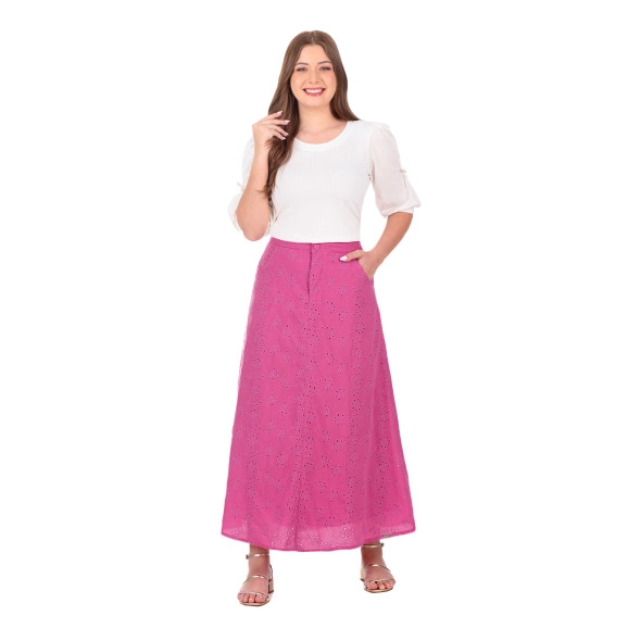Saia confeccionada em plano laise, cós tradicional com fechamento frontal por zíper e botão e possui forro.