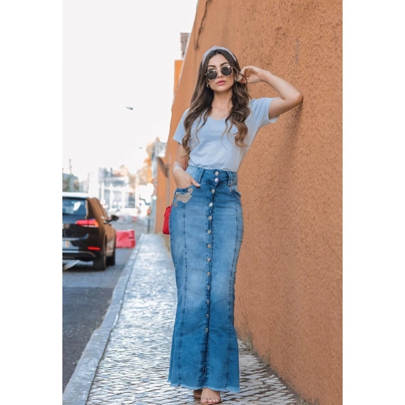 Detalhe: saia longa jeans com botões na frente, possui detalhe em aplicação, bolsos laterais e atrás, barra desfiada. Saia super moderna e despojada, fica lindo com salto ou tênis!