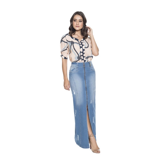 Detalhe: saia longa jeans com fechamento em zíper na frente, possui bolsos atrás. Aquela saia maravilhosa para ninguém botar defeito!