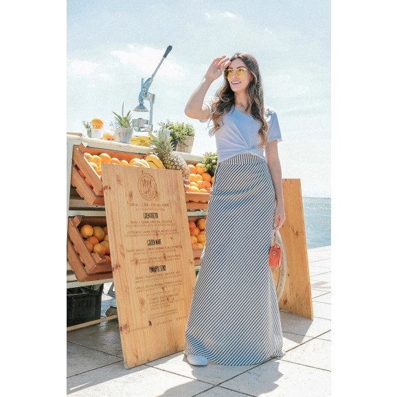 Detalhe: saia longa listrada, fechamento em zíper lateral. As saias longas são super versáteis, além de deixar qualquer look mais elegante!