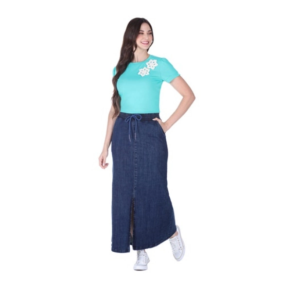 Saia confeccionada em jeans, elástico interno no cós, bolsos funcionais e fendas frontal e traseira.