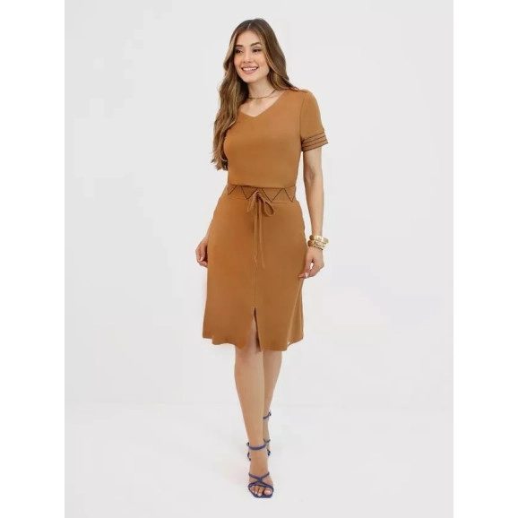 saia de moletinho com cós de elastico bordado, detalhe de víes para amarração e comprimento midi com shape evasê e fenda frontal.