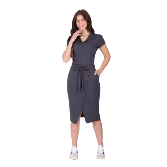 Saia confeccionada em molecotton e ribana, cós largo com elástico interno e detalhe em ilhós e galão, bolsos funcionais, detalhe frontal em revel com fenda e possui forro.