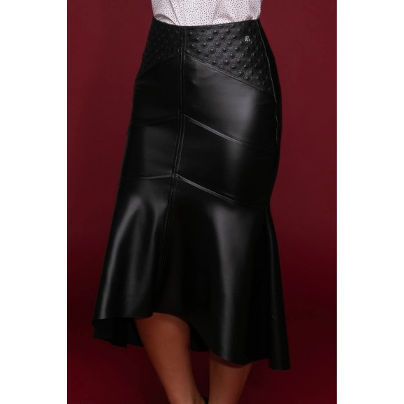 Saia Midi em Couro Preta Via Tolentino confeccionada em couro ecológico, possui um recorte diferenciado, fechamento em zíper atrás. Composição do tecido 94%poliéster 6%elastano. Chega o inverno, e as peças em couro se destacam, essa saia então, sem palavras!