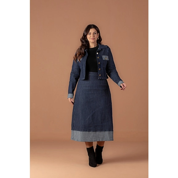 Apresentamos com orgulho a encantadora Saia Midi de Jeans com Elastano da Hadaza, uma peça que irá revolucionar o seu guarda-roupa com estilo e conforto incomparáveis. Com uma modelagem evasê que valoriza a feminilidade, esta saia é perfeita para mulheres que desejam se sentir elegantes e confiantes em qualquer ocasião. O tecido de jeans com elastano oferece flexibilidade e liberdade de movimento, garantindo conforto durante todo o dia. Além disso, os detalhes listrados no tecido adicionam um toque de sofisticação e estilo único a esta peça versátil. Combine esta saia com uma blusa floral para um look feminino e romântico, ou opte por uma camiseta básica para um visual mais casual e descontraído. Complete o conjunto com um par de sandálias de salto alto para um toque de glamour ou com sapatilhas para um estilo mais casual. Não perca a oportunidade de adicionar a Saia Midi de Jeans com Elastano da Hadaza ao seu guarda-roupa. Com esta peça versátil e deslumbrante, você estará pronta para arrasar em qualquer ocasião. Garanta a sua hoje mesmo e descubra um novo nível de estilo e conforto!