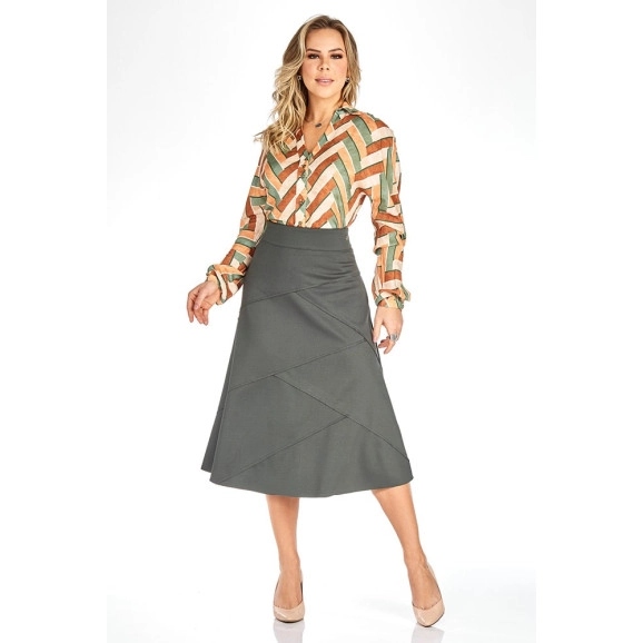Produto: Saia Midi Evasê Verde Via Tolentino com fechamento em zíper lateral, confeccionada em 94% Poliester 6% Elastano. As saias midi são super versáteis, podendo criar looks dos mais clássicos aos mais despojados.
