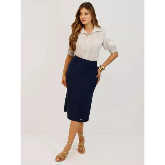 Saia midi em alfaiataria, que transmite sofisticação e leveza. Possui modelagem reta levemente evasê, valorizando a silhueta com caimento impecável. O cós largo estruturado confere conforto e melhor ajuste ao corpo, enquanto os botões encapados aplicados na frente trazem um toque clássico e atemporal. O tecido de alfaiataria proporciona aparência polida e acabamento refinado, ideal para compor produções elegantes e versáteis.