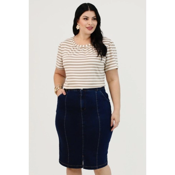 Saia no tecido de malha denim com fenda frontal e recorte nas linhas princesas. Possui bolso faca e traseiro sobreposto. Fechamento em botão e zíper na vista J