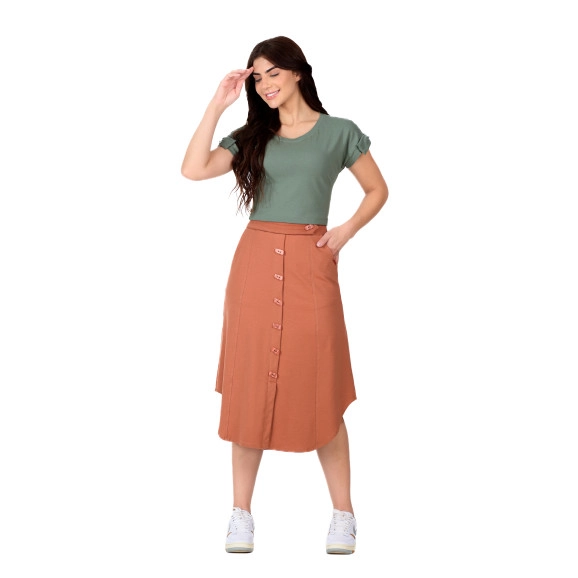 Saia confeccionada em malha moletinho e ribana, cós em ribana com elástico interno, revel falso com botões fixos, bolsos funcionais e não possui forro.