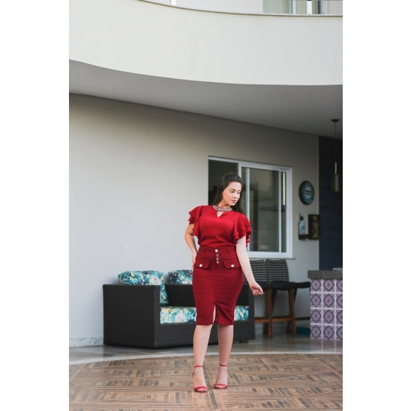 Saia Recortes Bordô Vecchi, possui bolsos, botões e fenda frontais, confeccionada em 77%Algodão 27%Poliester 1%Elastano. Saia linda e versátil para você usar seja em um ambiente de trabalho ou mais casual.