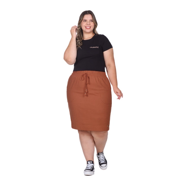 Saia confeccionada em linho, elástico interno no cós, canaleta com viés, bolsos funcionais e possui forro.