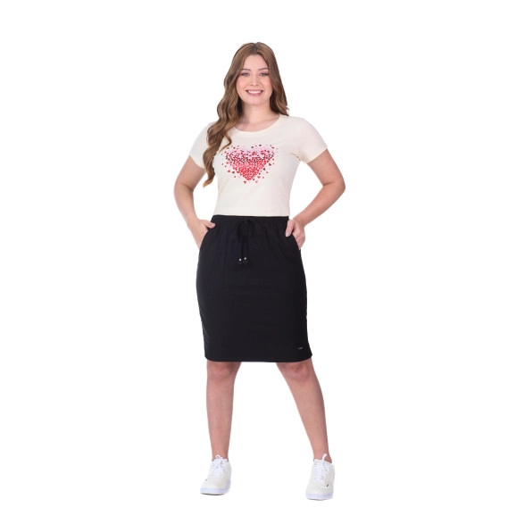 Saia confeccionada em linho, elástico interno no cós, canaleta com viés, bolsos funcionais e possui forro.