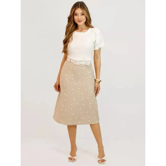 Saia midi no tecido alfaiataria bordada com cós revel, fechamento em zíper lateral e recorte na linha princesa. Possui cinto de couro.