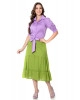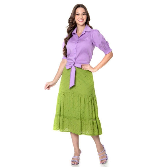 Saia de laise com fechamento por zíper. Recortes com franzidos e babado com “cabecinha” na barra. Possui forro. Composição 100% algodão