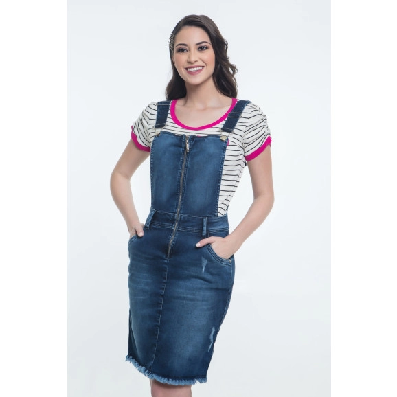 Detalhe: salopete jeans com zíper na frente, possui bolsos laterais e atrás, alças ajustáveis, barra desfiada. Peça atemporal, além de ser super versátil! Pode ser usada com salto, tênis, rasteirinhas...