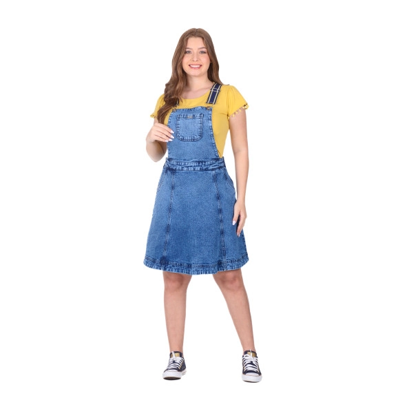 Salopete confeccionada em jeans, alças em elástico com regulador, fechamento por zíper lateral, bolsos funcionais e não possui forro.