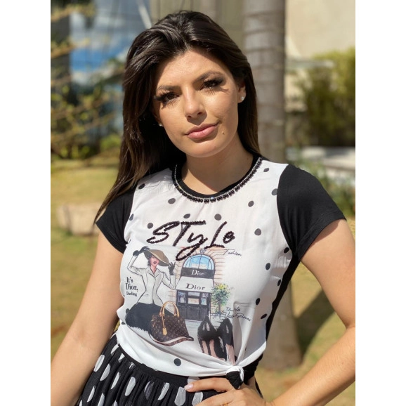 T-shirt Style Poá Victoria's Princess confeccionada na malha viscolycra, possui detalhe bordado em pedrarias. Composição: 96% Viscose 4% Elastano. Frente 100%Poliester . Blusa estilosa, super em alta.