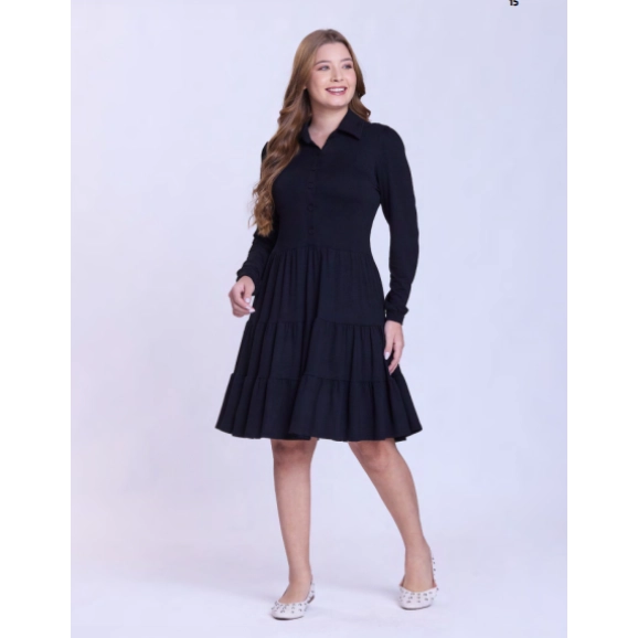 Vestido em moletinho, decote com gola, fechamento frontal por botões e mangas longas com punho.