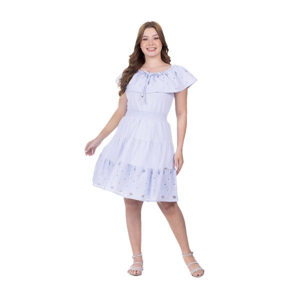 Vestido confeccionado em malha lisa e laise, decote