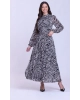 Vestido em tecido plano chiffon estampado, decote com gola mais alta, fechamento por botões no decote traseiro, mangas longas com elástico interno, cintura com elástico interno, saia plissada e acompanha faixa e possui forro.