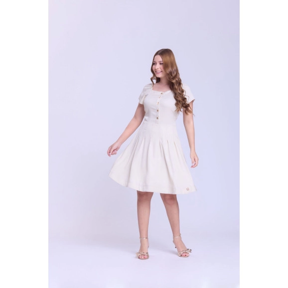 Vestido em tecido plano, decote reto, detalhe frontal de botões, elástico interno nos ombros, lastex meio costas, mangas curtas, zíper invisível lateral e possui forro.