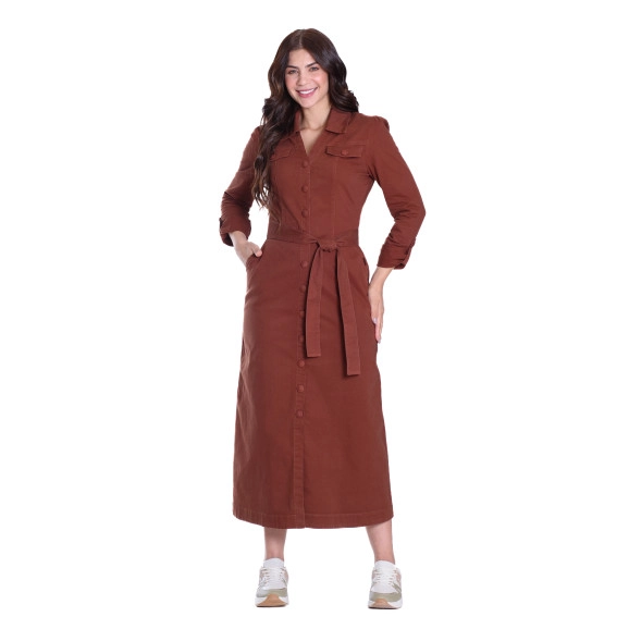 O vestido Amanda foi confeccionado em jeans color, fechamento frontal por botões encapados, bolsos funcionais, mangas com martingale e acompanha faixa.