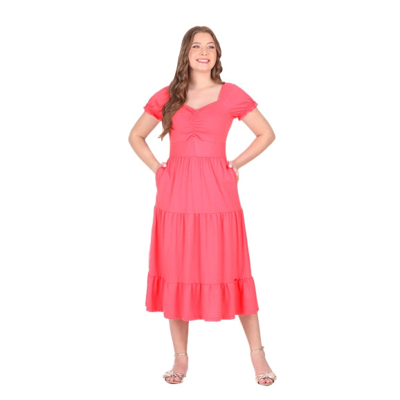 Vestido confeccionado em malha texturizada e ribana, decote levemente em V, busto com franzido, botões fixos, mangas com elástico interno, cintura em ribana, bolsos funcionais e possui forro.