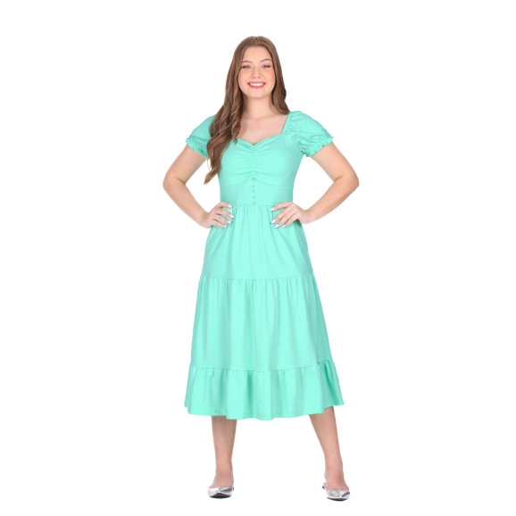 Vestido confeccionado em malha texturizada e ribana, decote levemente em V, busto com franzido, botões fixos, mangas com elástico interno, cintura em ribana, bolsos funcionais e possui forro.