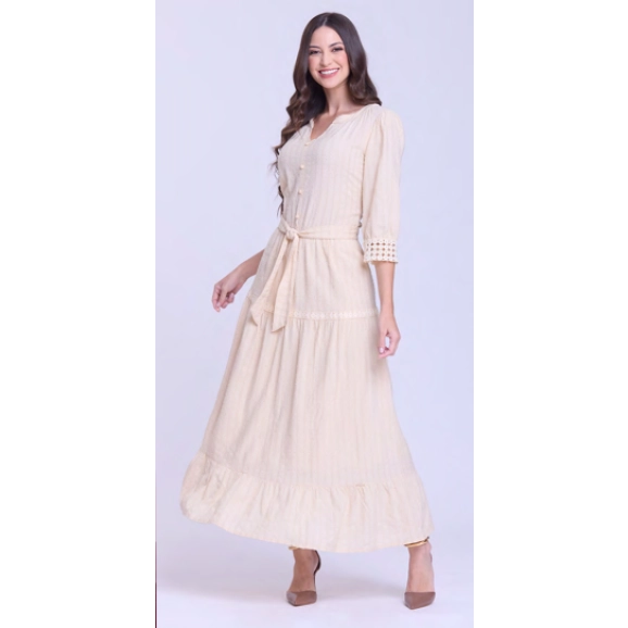 Vestido em tecido plano texturizado de algodão, decote redondo com V, botões fixos, mangas ¾, detalhe em guipir, acompanha faixa, elástico interno na cintura e possui forro.