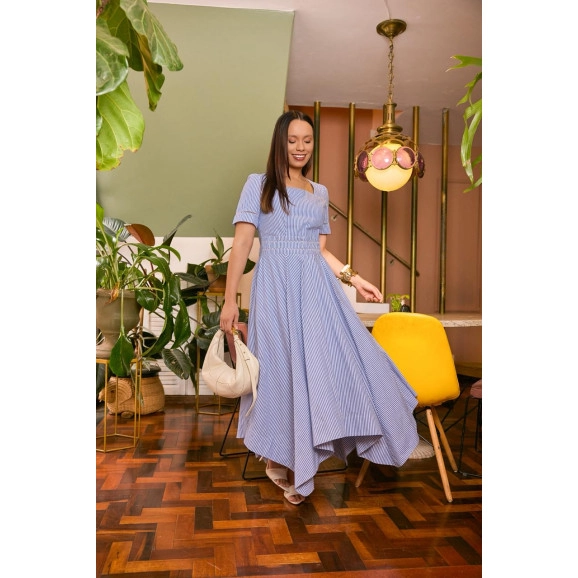 Vestido Ana Em Tricoline Listrado Azul Jany Pim