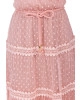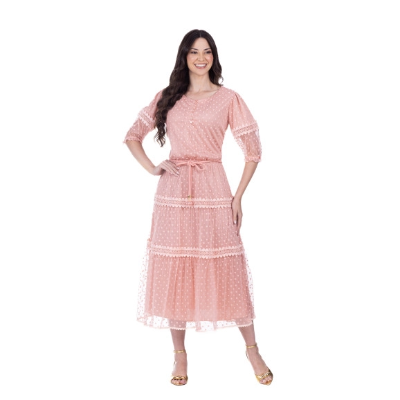 Vestido confeccionado em tecido plano tule bordado de poá, decote redondo com fechamento frontal por botões, mangas com elástico e babados, detalhe em guipir, elástico interno na cintura, acompanha cordão com ponteiras, barra em guipir e possui forro.