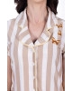 Camisola confeccionada em malha, decote com gola, detalhe em viés, fechamento frontal por botões, bordado frontal industrial e mangas curtas