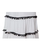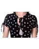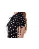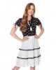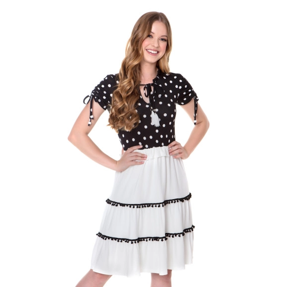 Vestido em mix de tecido, sendo eles uma malha canelada com estampa em poá e moletinho liso. Seu decote é mais fechado com babadinho e gola com viés para amarrar, as mangas são curtas com drapeado regulável. A saia tem o detalhe do babado na cintura e dos aviamento nos recortes. Possui forro . Composição 97% viscose 3% elastano
