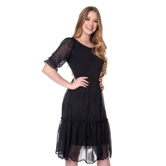 Vestido em tecido plano com aspecto de laise barrado. Decote redondo, mangas levemente bufantes com babado. Saia com shape mais volumoso com babado. Costas com detalhe em lastex e amarril. Possui forro.Composição 100% poliéster