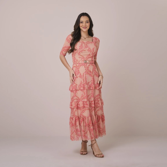 Vestido Aurora Em Tule Estampado Rosa Tatá Martello