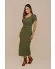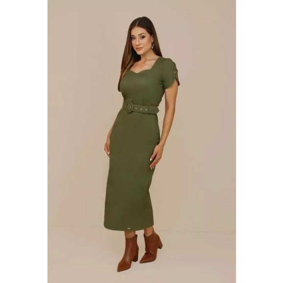 Vestido midi tubinho em sarja peletizada. Modelagem ajustada com caimento estruturado. Acompanha cinto encapado que valoriza a silhueta com elegância.