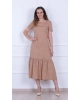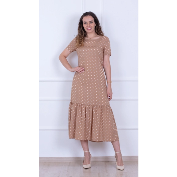 Vestido reto em viscose estampada de poás. Decote canoa. Manga curta. Peplum na barra. Combinação para forração. Comprimento Longuete.