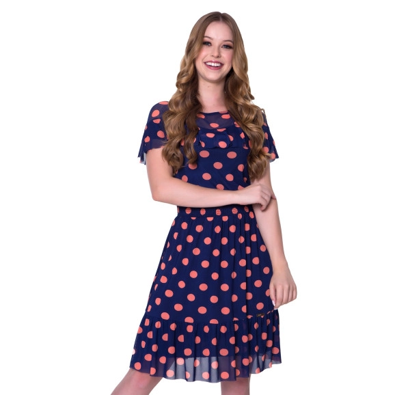 Vestido em tule estampado em poá, com decote redondo mais fechado, detalhe em babado que passa pela frente, mangas e costas da peça, lestex na cintura, saia mais volumosa com babado na barra. Possui forro. Composição 92% poliéster 8% elastano