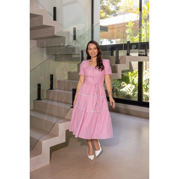 Vestido Carla Em Tricoline Listrado Vermelho Jany Pim