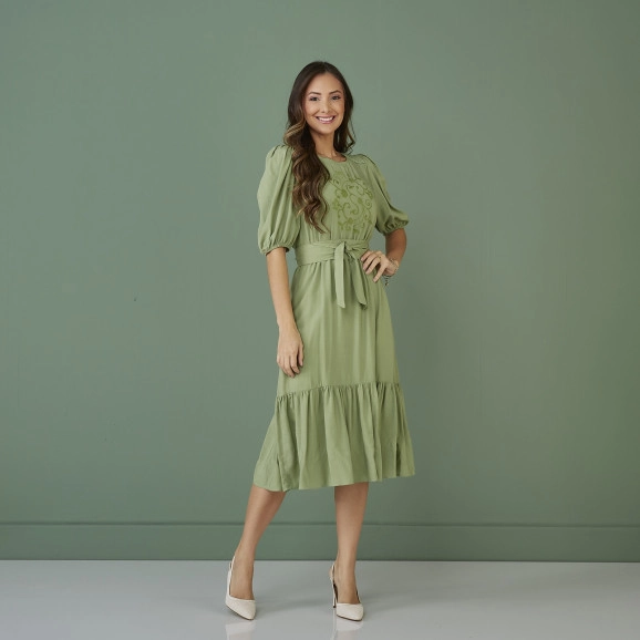 Vestido Tatá Martello Caroline. Confeccionado na Viscose, decote redondo, manga três quartos com elástico no punho, detalhes de entremeio no ombro, bordado industrial na parte da frente, elástico na cintura, modelagem evasê, babado na barra, acompanha faixa do mesmo tecido, forrado. Produzido em três variantes de cor.